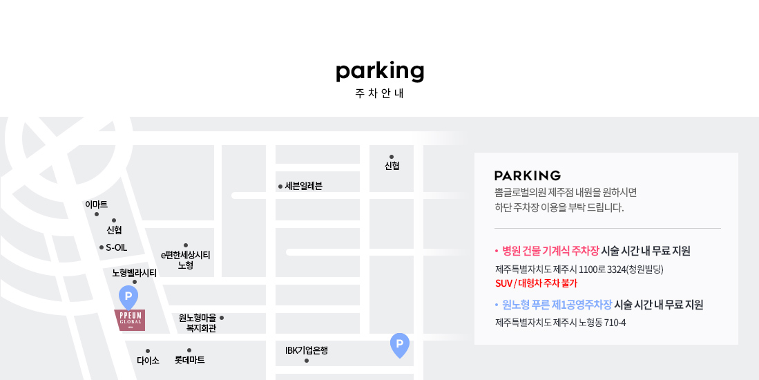 쁨글로벌의원 제주점은 제주시 1100로 3324 3~5층에 위치한 피부과의원으로 평일 월, 금 밤 8시까지 야간진료로 편안하게 진료 받으실 수 있습니다. 064-900-2600으로 편하게 예약하세요.